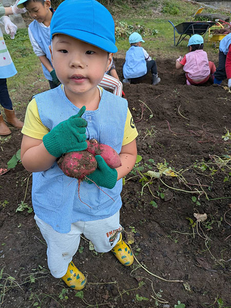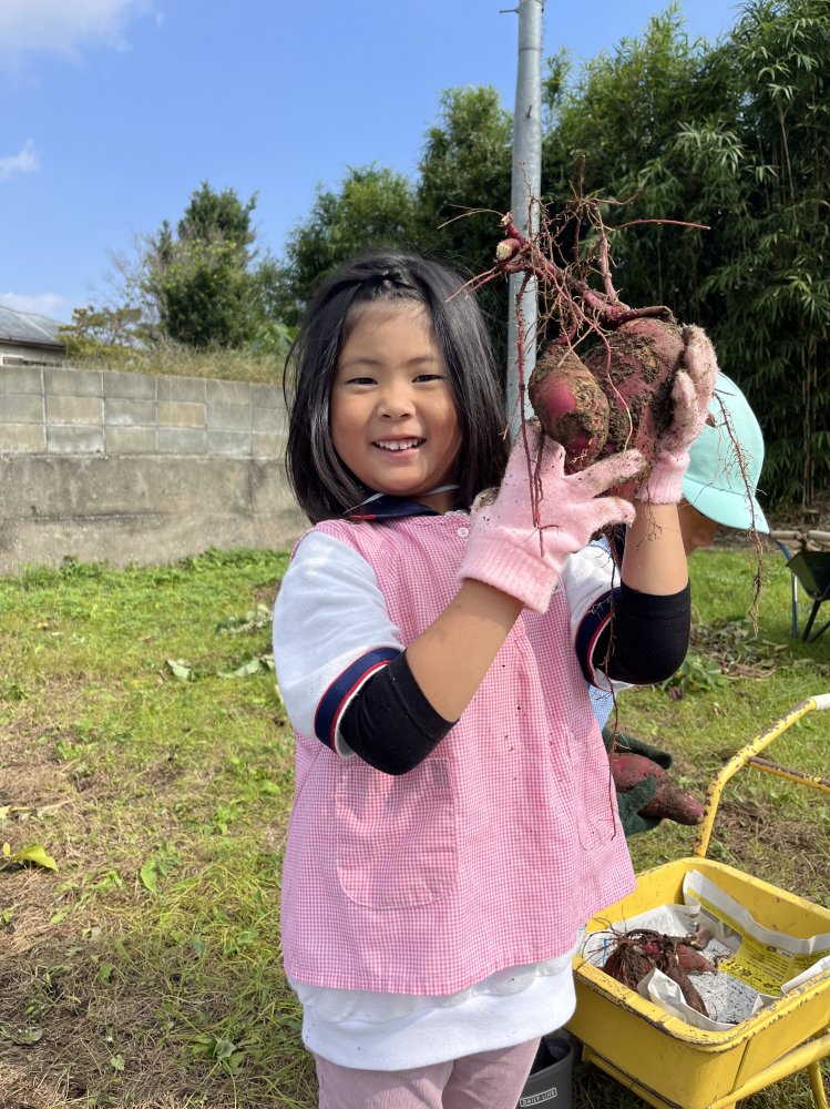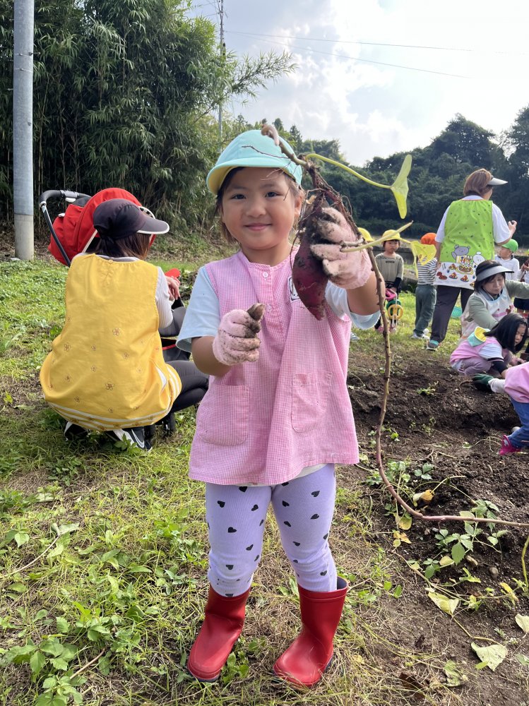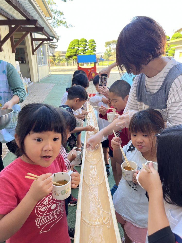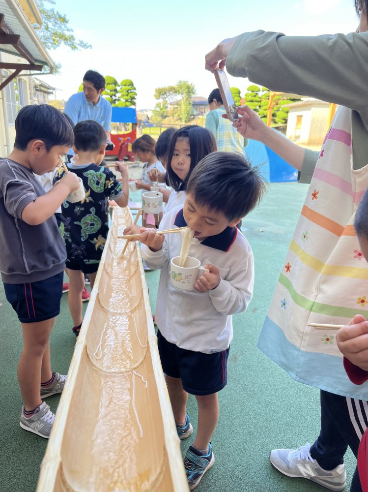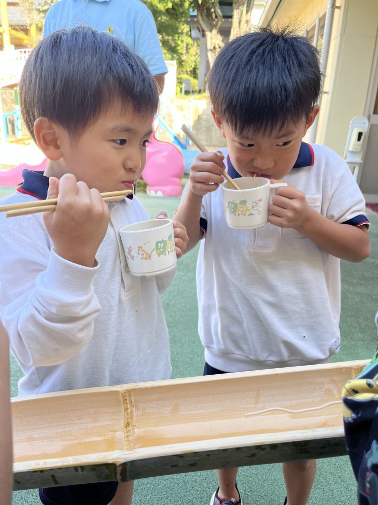 午前中は畑でイモ掘りをして、午後は流しそうめんをしました。スコップで一生懸命土を掘り、イモを見つけると「あった~!」と大喜びでたくさん収穫していました。流しそうめんは初体験のおともだちが多くて、最初はうまくそうめんを掴めなくて流れていっていましたが、徐々に掴めるようになるとたくさん取って食べて楽しんでいました。