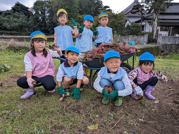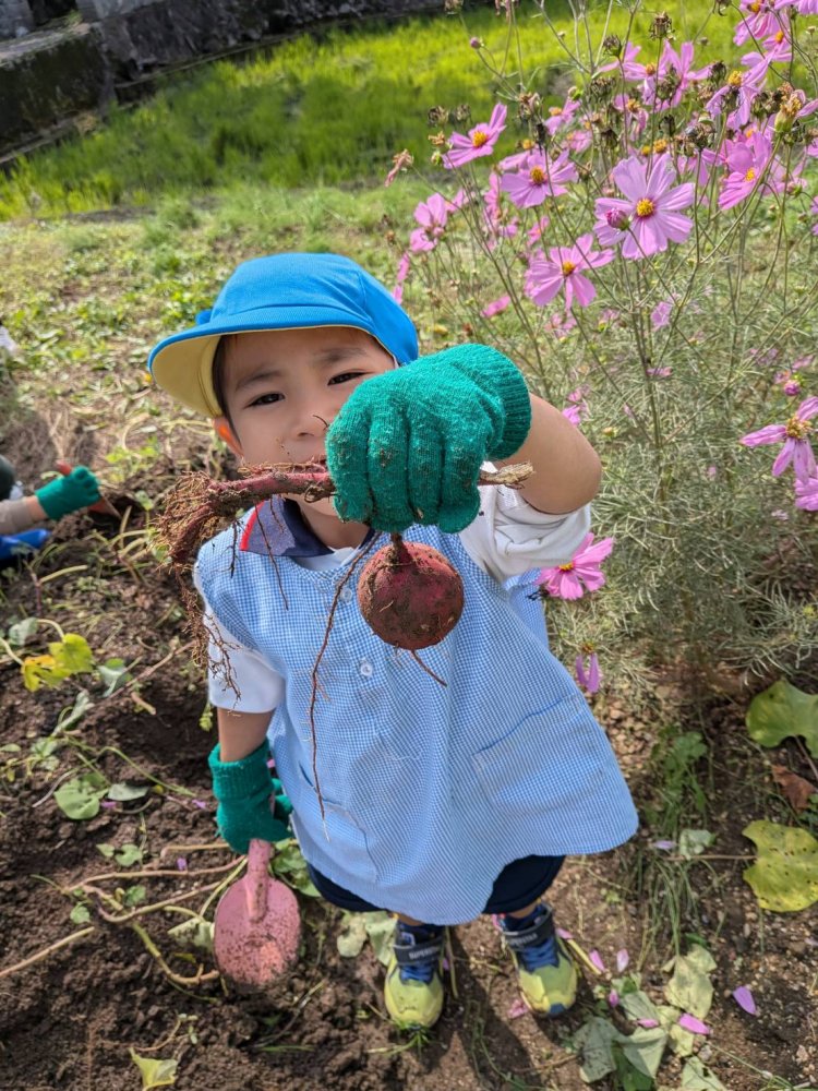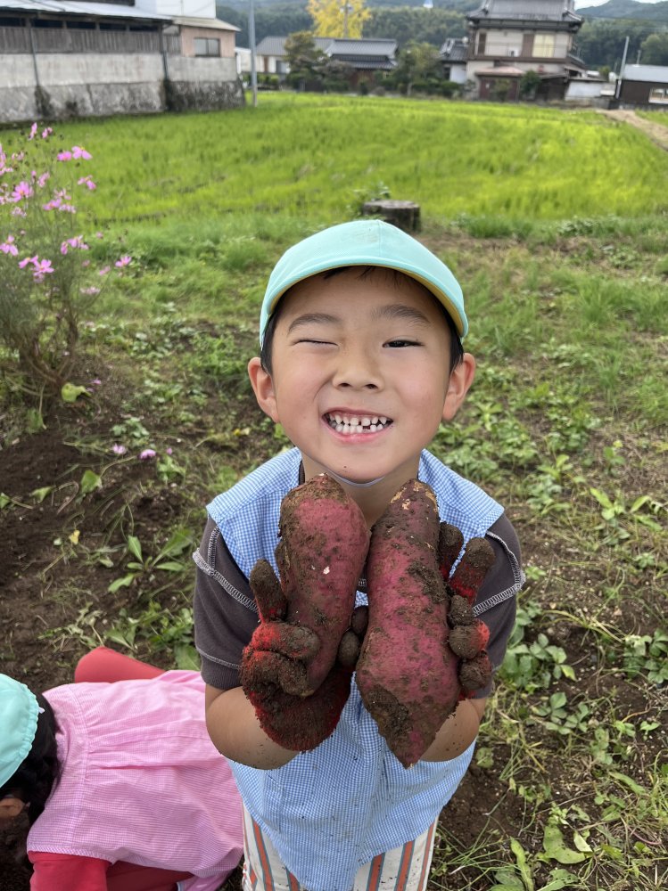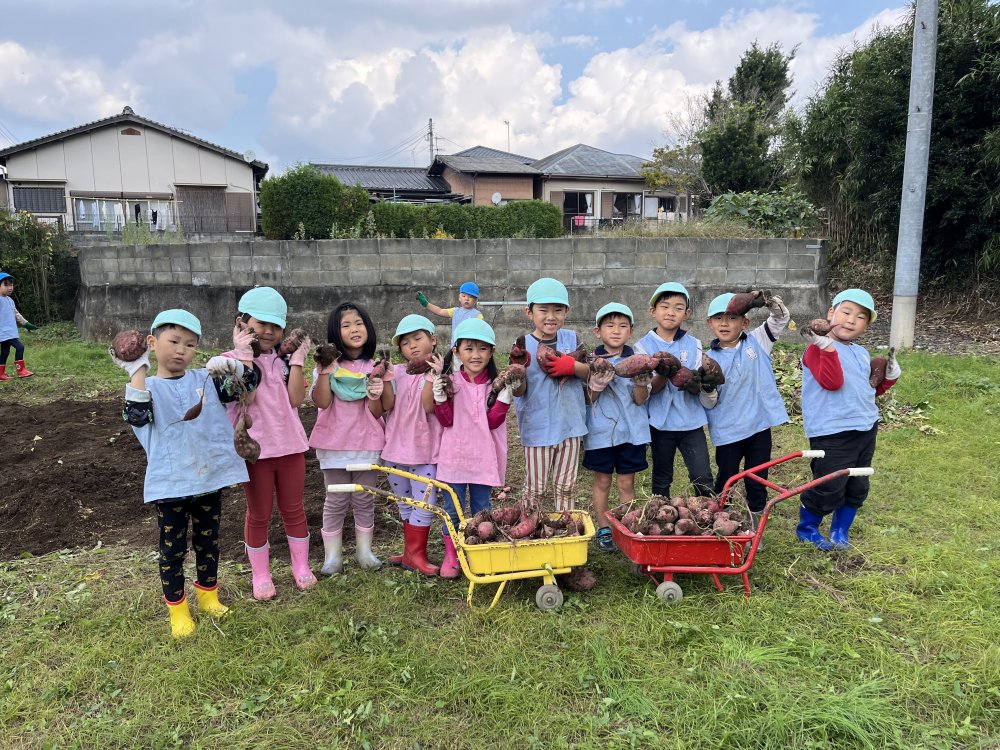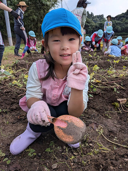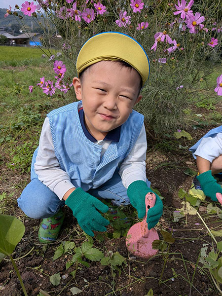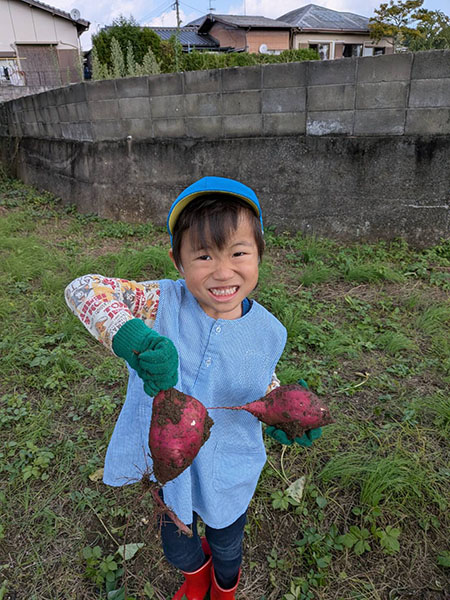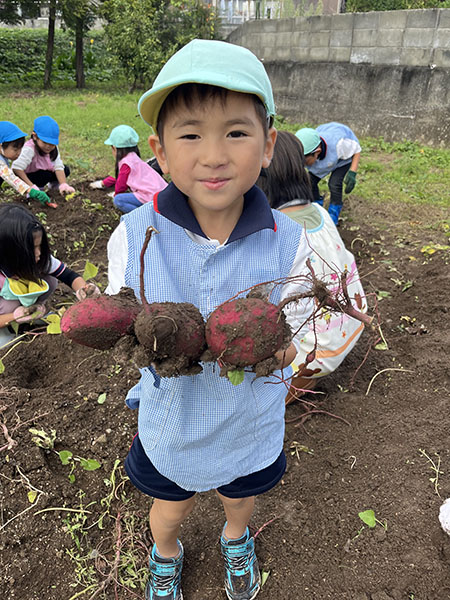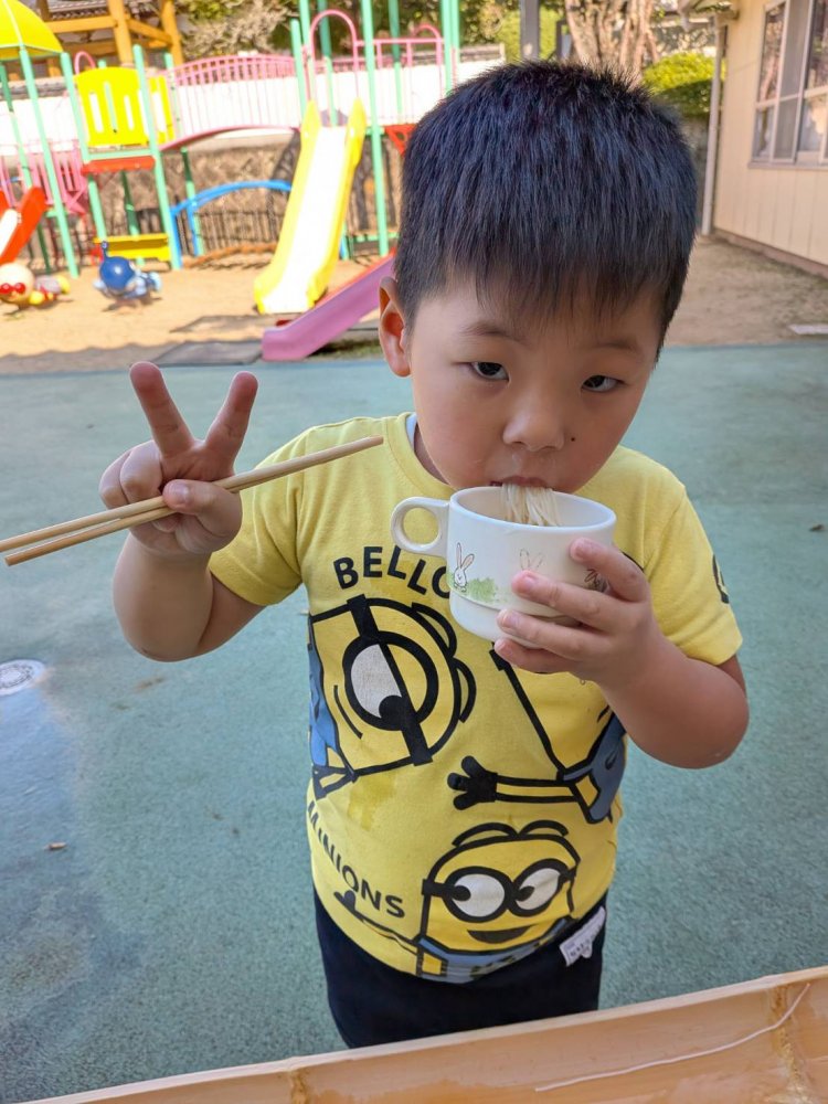 午前中は畑でイモ掘りをして、午後は流しそうめんをしました。スコップで一生懸命土を掘り、イモを見つけると「あった~!」と大喜びでたくさん収穫していました。流しそうめんは初体験のおともだちが多くて、最初はうまくそうめんを掴めなくて流れていっていましたが、徐々に掴めるようになるとたくさん取って食べて楽しんでいました。