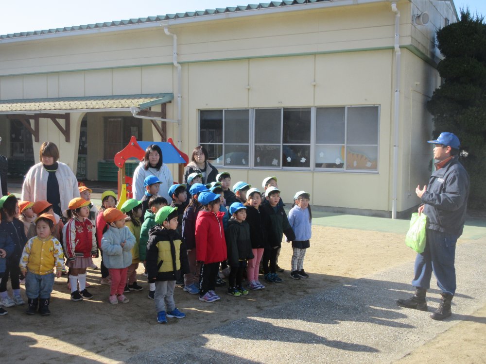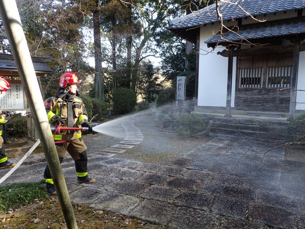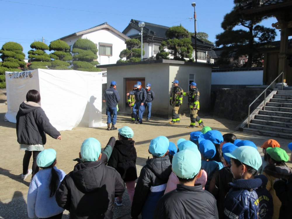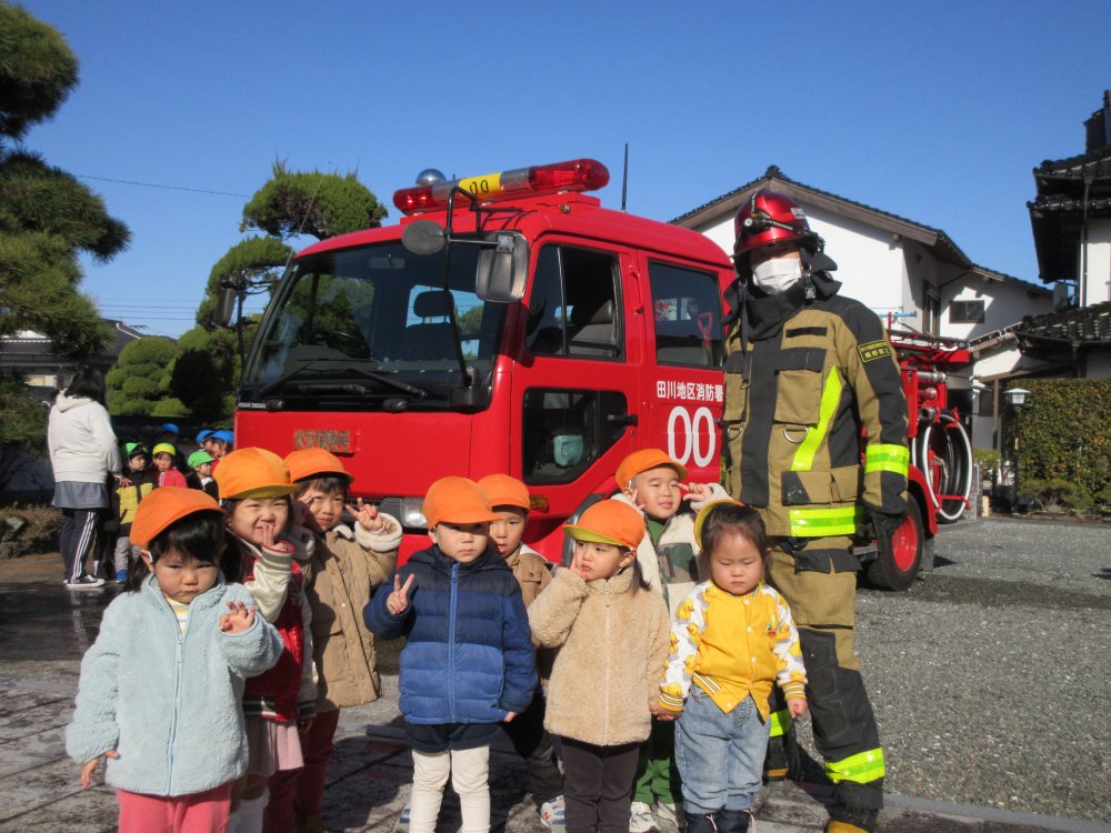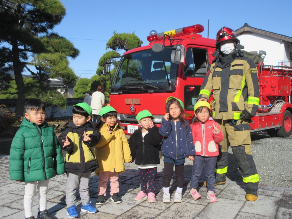 毎年1月26日は文化財防火デーです。お寺で行われる防火訓練を、今年は保育園も合同で行わせていただきました。境内から火の手が上がっているのを保育士が発見、初期消火を行い、通報によって駆けつけた消防車が実際に放水を行って消火完了する、という内容です。また、訓練終了後(体に無害な)煙を充満させたテントの中を抜けていく、火災の疑似体験を行いました。火事の怖さ、訓練の大切さを身を以てよりいっそう感じました。