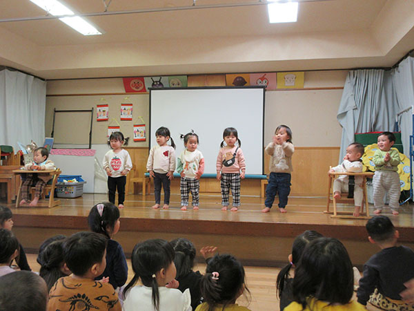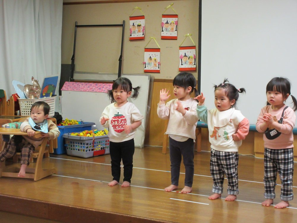 ひな祭りをしました。お部屋の中を暗くしてスライド映写機(←とっても古い!)でひな祭りのお話を見たり、みんなでお歌を歌ったりしました。その後は、もうすぐ卒園式を迎えるきりん組さんとの別れを惜しんでお別れ会をしました。りす組さんから順番にステージで出し物をしてくれたり、先生たちも混じってじゃんけん列車をしたりして遊びました。