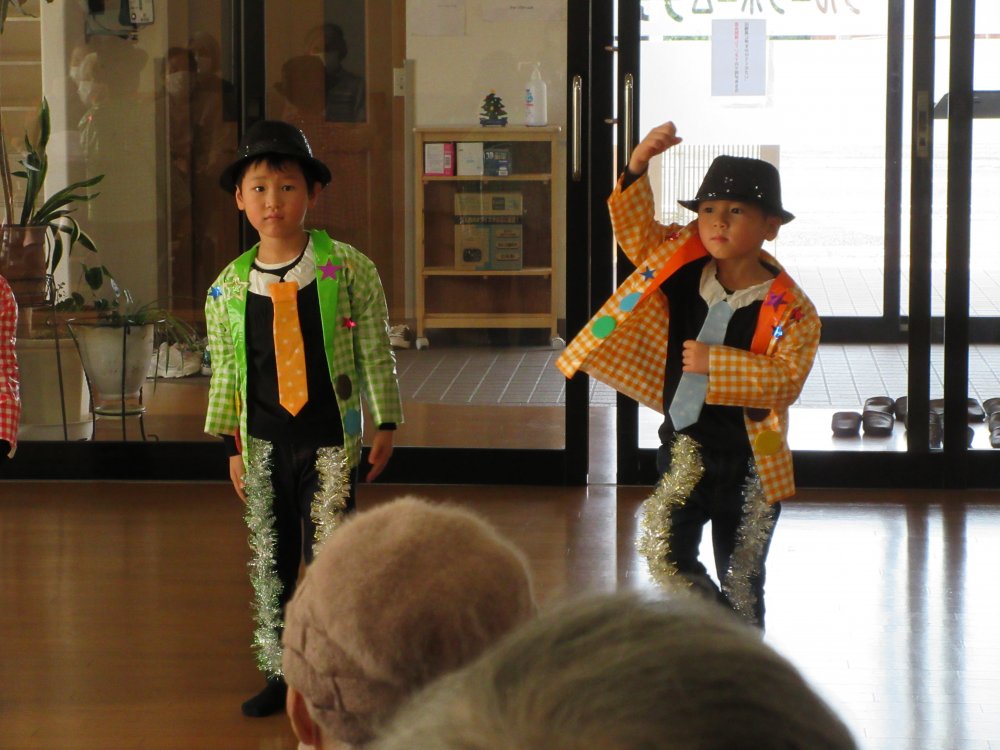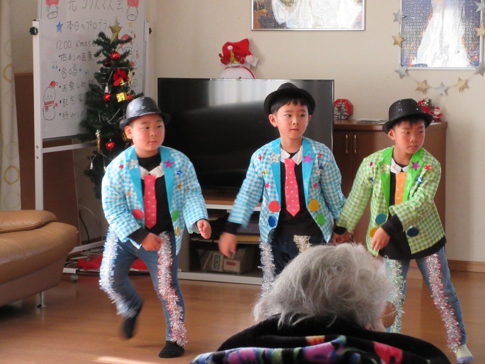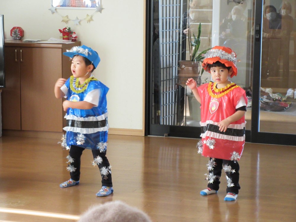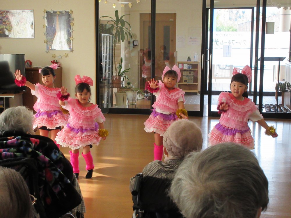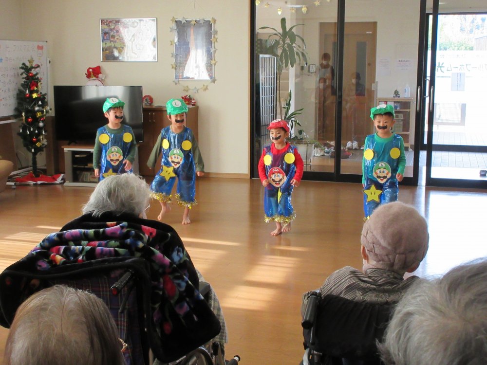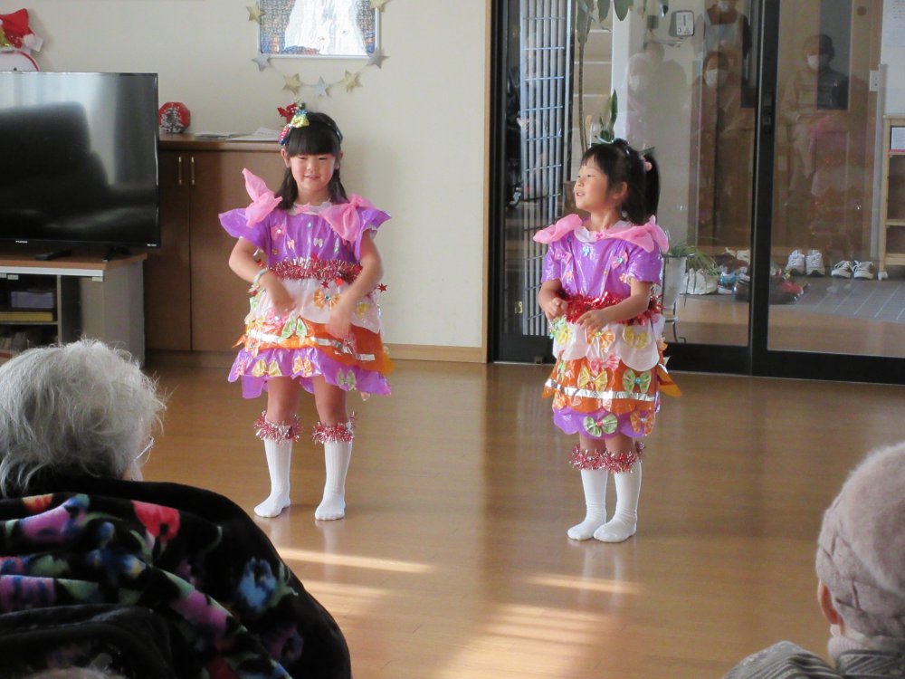 グループホーム光を慰問で訪れ、グループホーム光の皆様の前で園児たちの歌や踊りを披露させていただきました。子どもたちもいつもと違う環境で緊張した様子でしたけど、頑張って演技していました。皆様にも喜んでいただけて良かったです。また来年お会いできることを楽しみにしています。