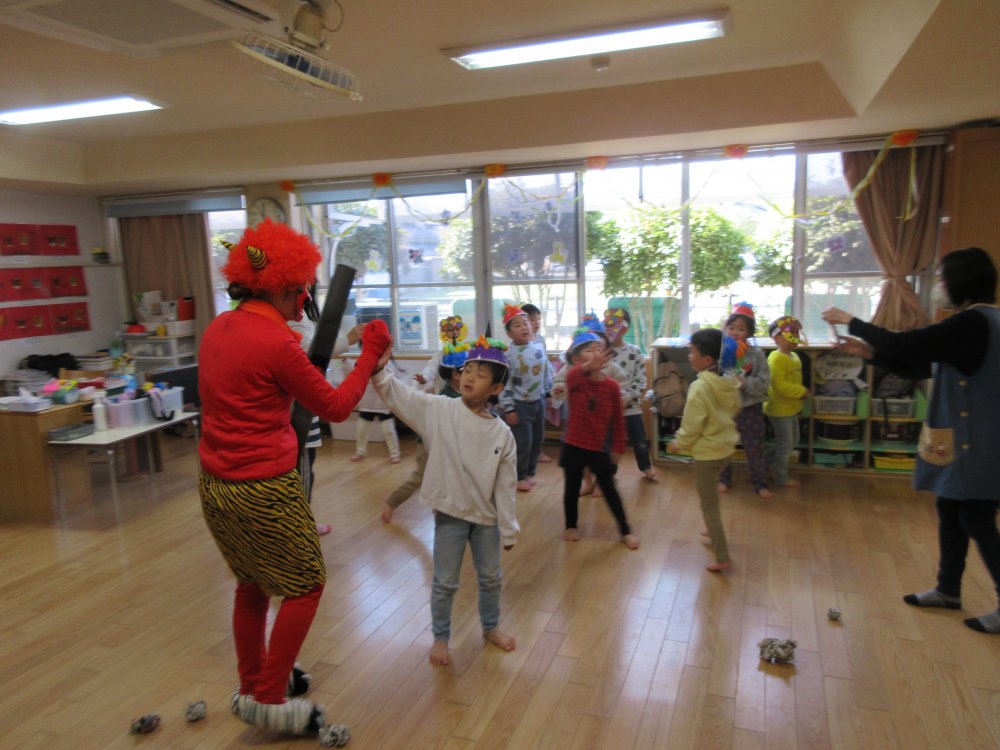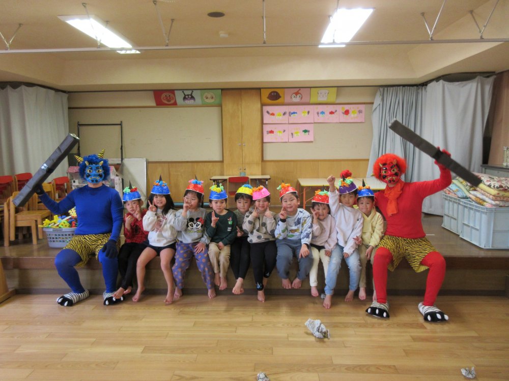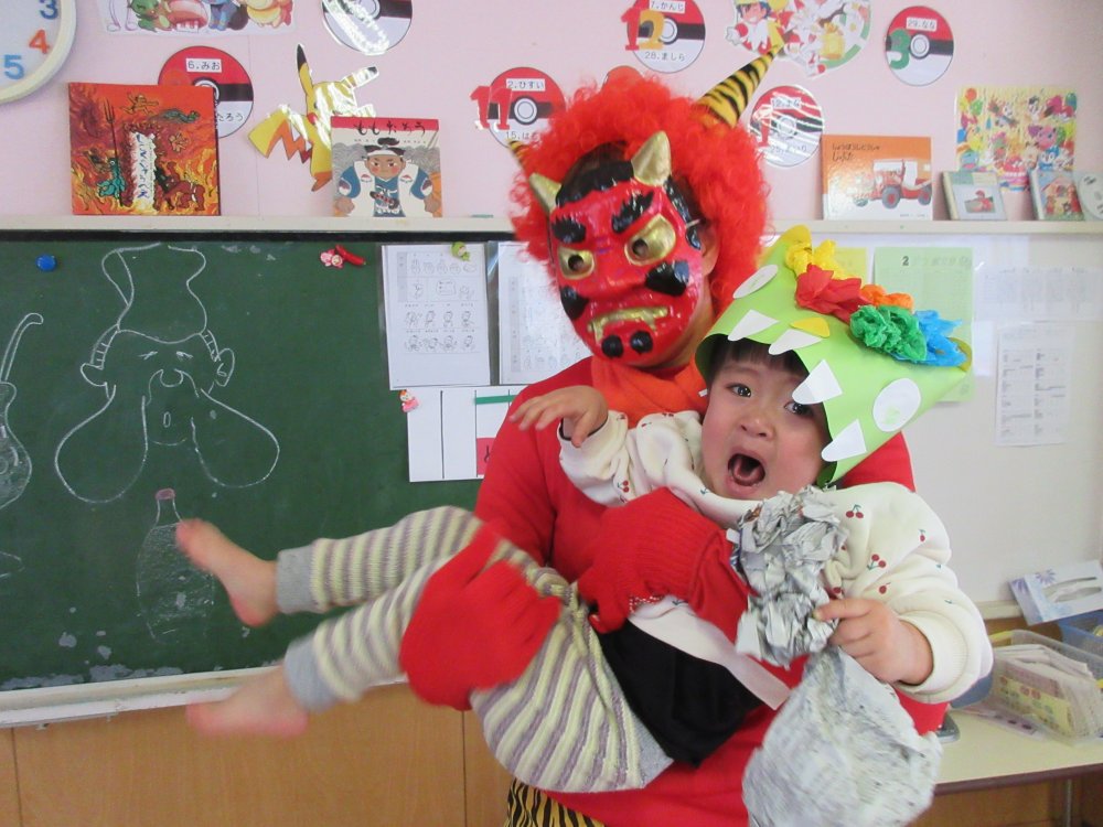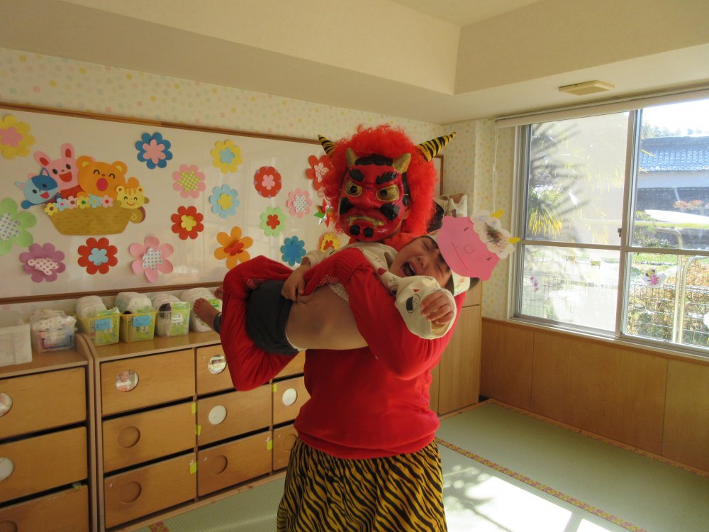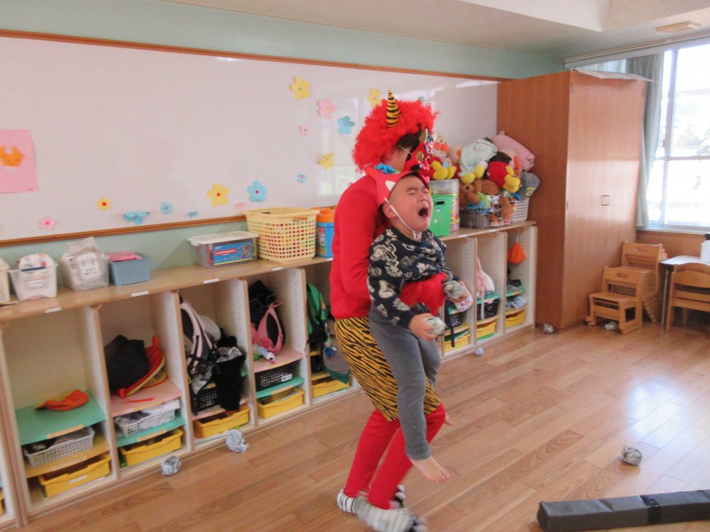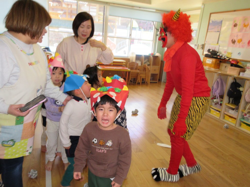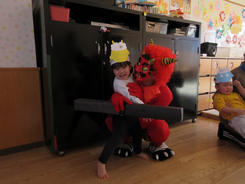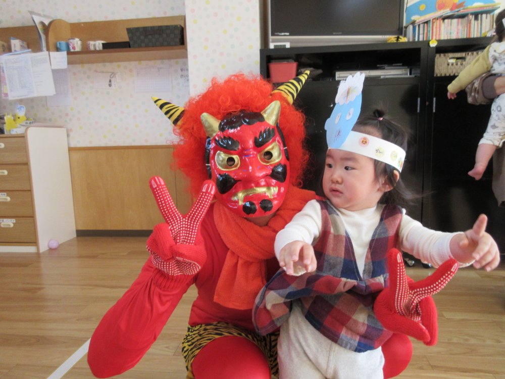 豆まきをしました。豆まきの日が近づいてくると、子どもたちは「鬼さん、明日来る?」と毎日気にしていました。保育室に鬼が入ってくると、泣きながら捕まらないように必死に逃げていました。最後にはしっかりと指切りをして、「悪いことはしません!」や「おともだちと仲良くします!」などと約束をしました。