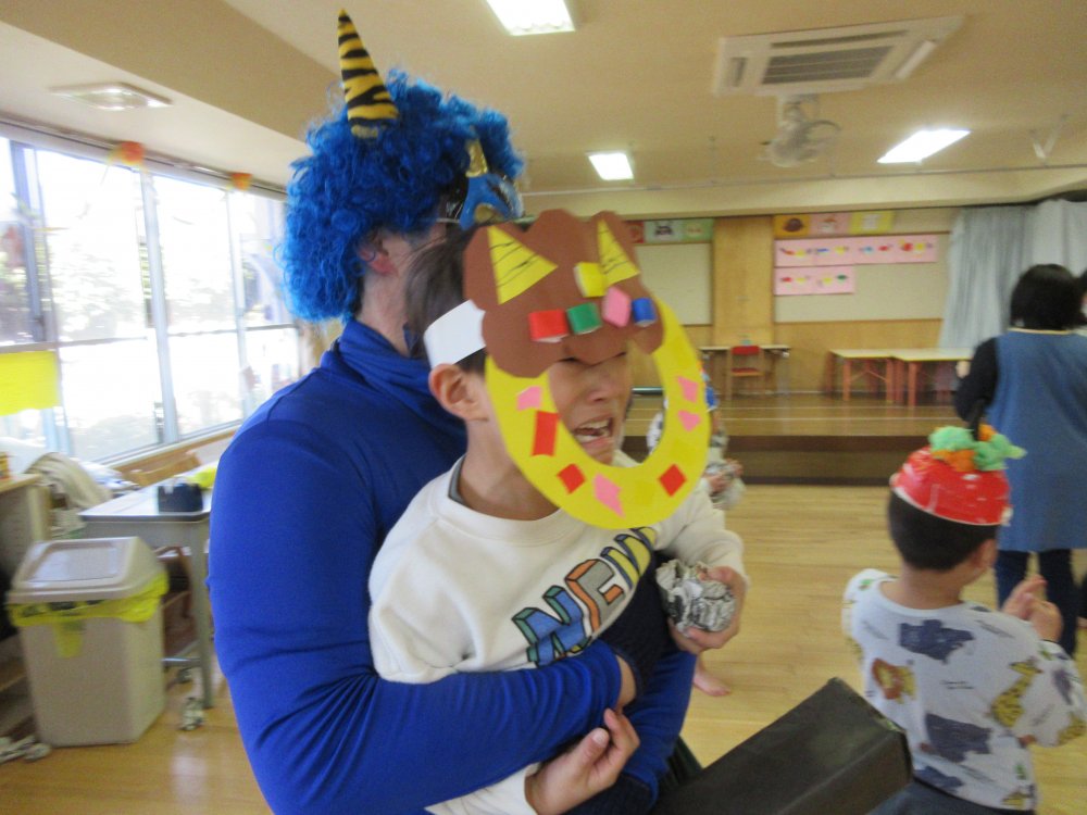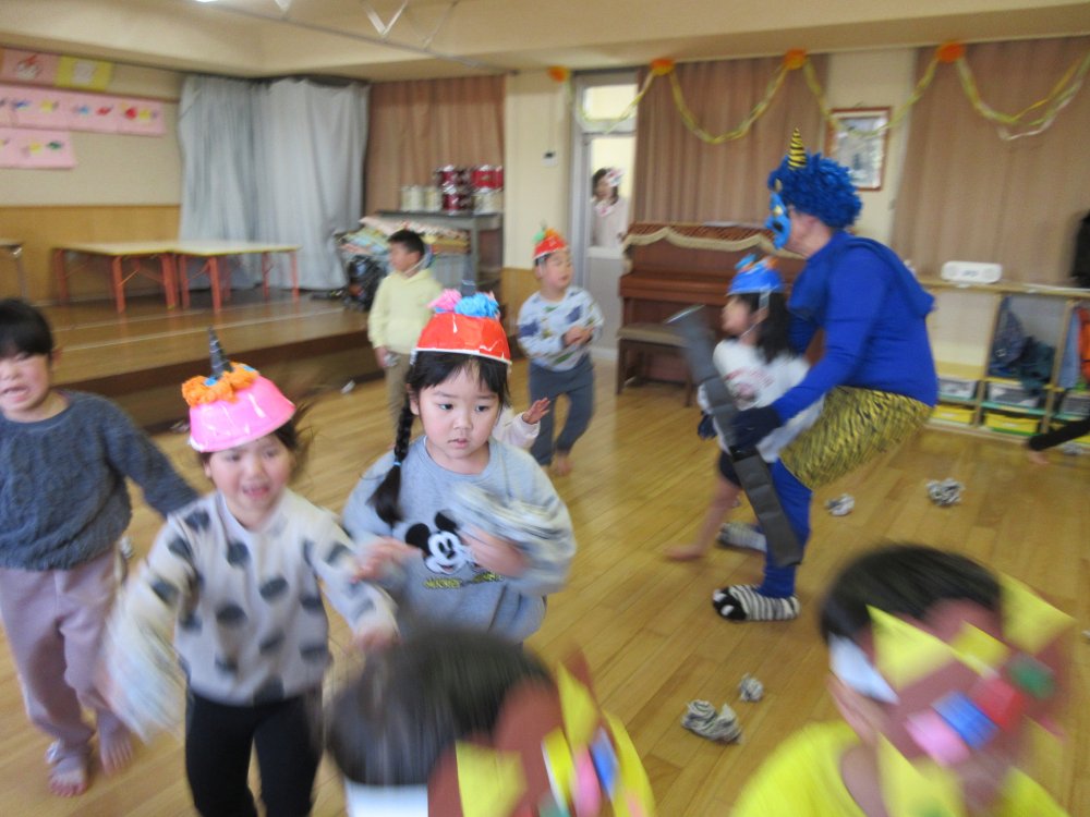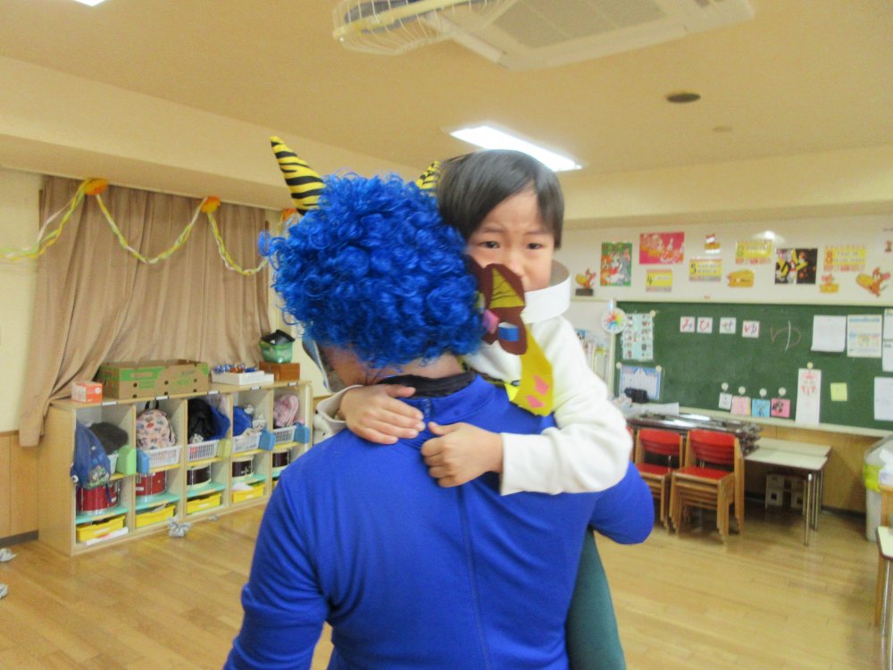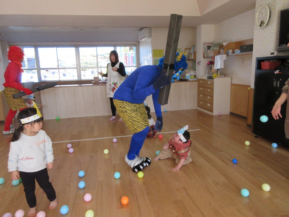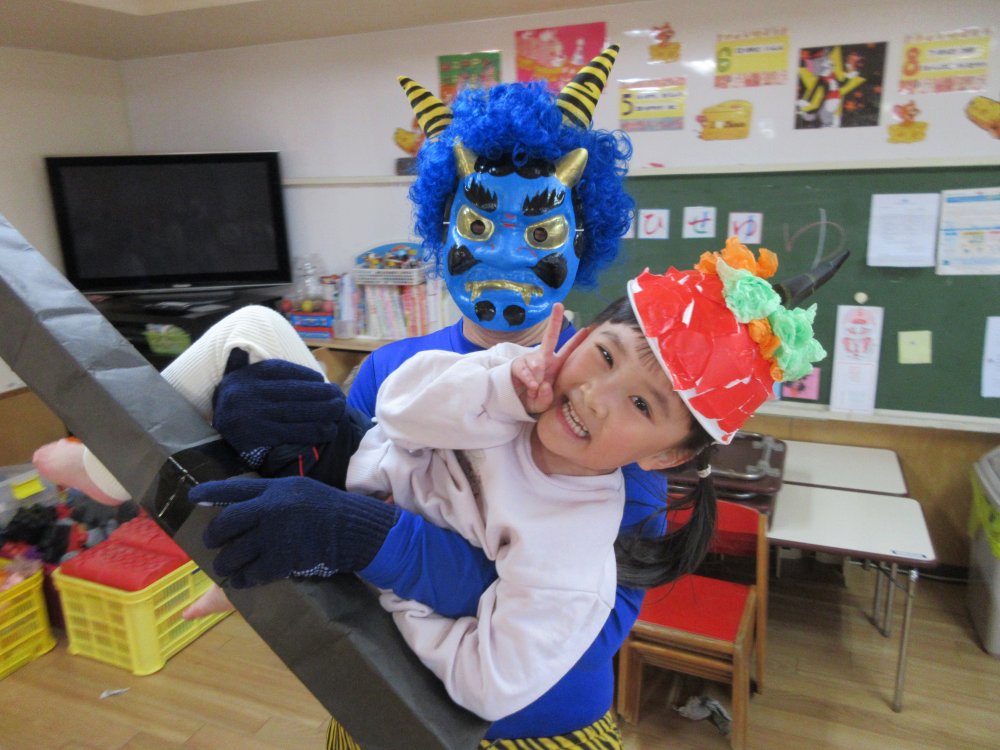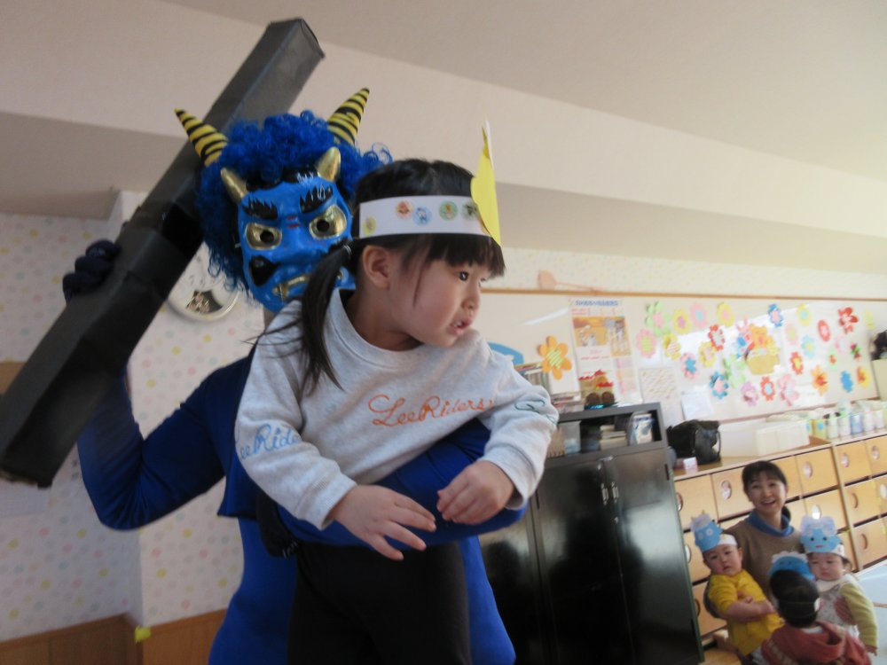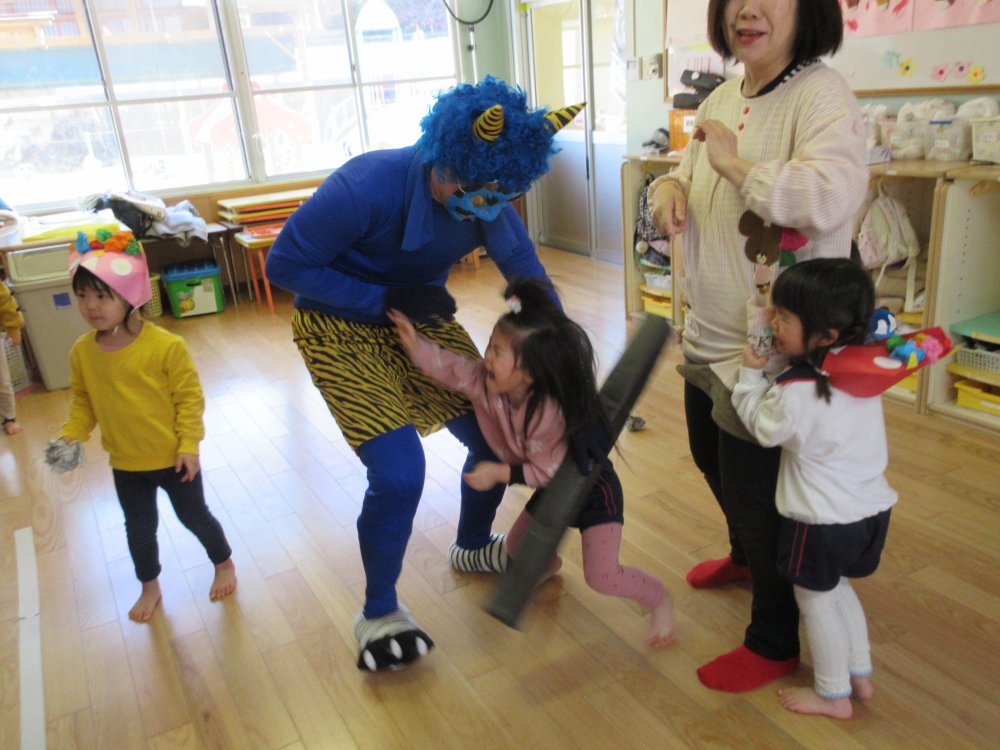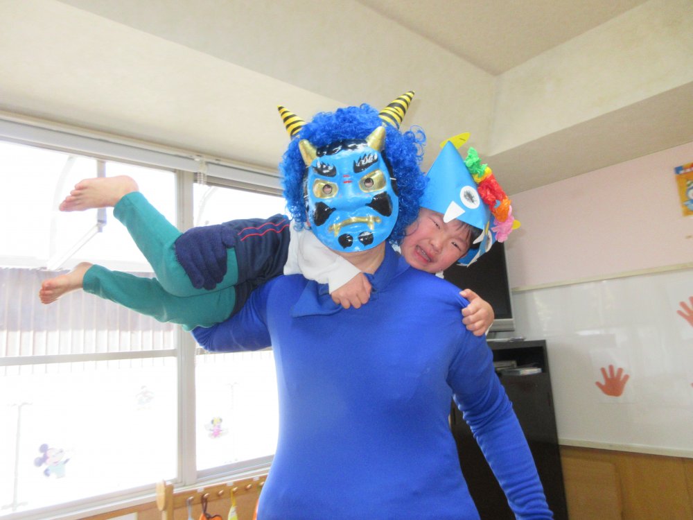 豆まきをしました。豆まきの日が近づいてくると、子どもたちは「鬼さん、明日来る?」と毎日気にしていました。保育室に鬼が入ってくると、泣きながら捕まらないように必死に逃げていました。最後にはしっかりと指切りをして、「悪いことはしません!」や「おともだちと仲良くします!」などと約束をしました。