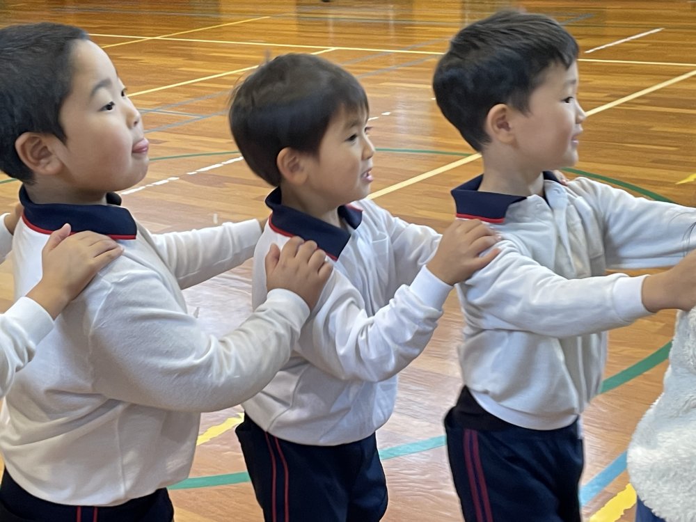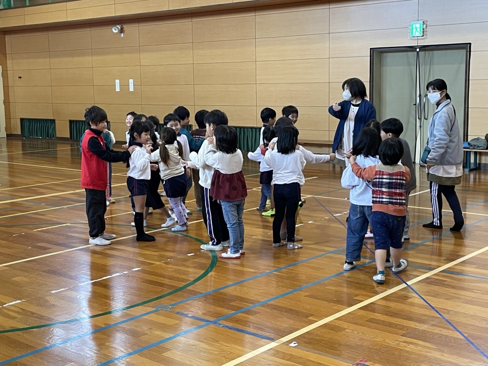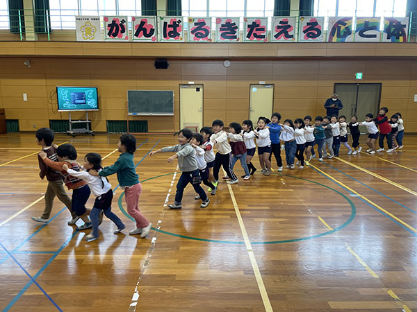 年長組さんと真崎小学校の1年生との交流会が真崎小学校の体育館で行われました。今年度初めて実施しました。小学校1年生のおにいちゃん、おねえちゃんたちと一緒にじゃんけん列車等で遊んで交流を深めつつ、小学校の雰囲気を体験しました。子どもたちはあっという間に雰囲気に慣れたようでした。それに、おにいちゃん、おねえちゃんたちの先生の話を聞く態度や、待つ姿勢がかっこよかったので、頑張って真似しました。小学校の皆さん、交流会の内容をいろいろ考えてくださってありがとうございました。