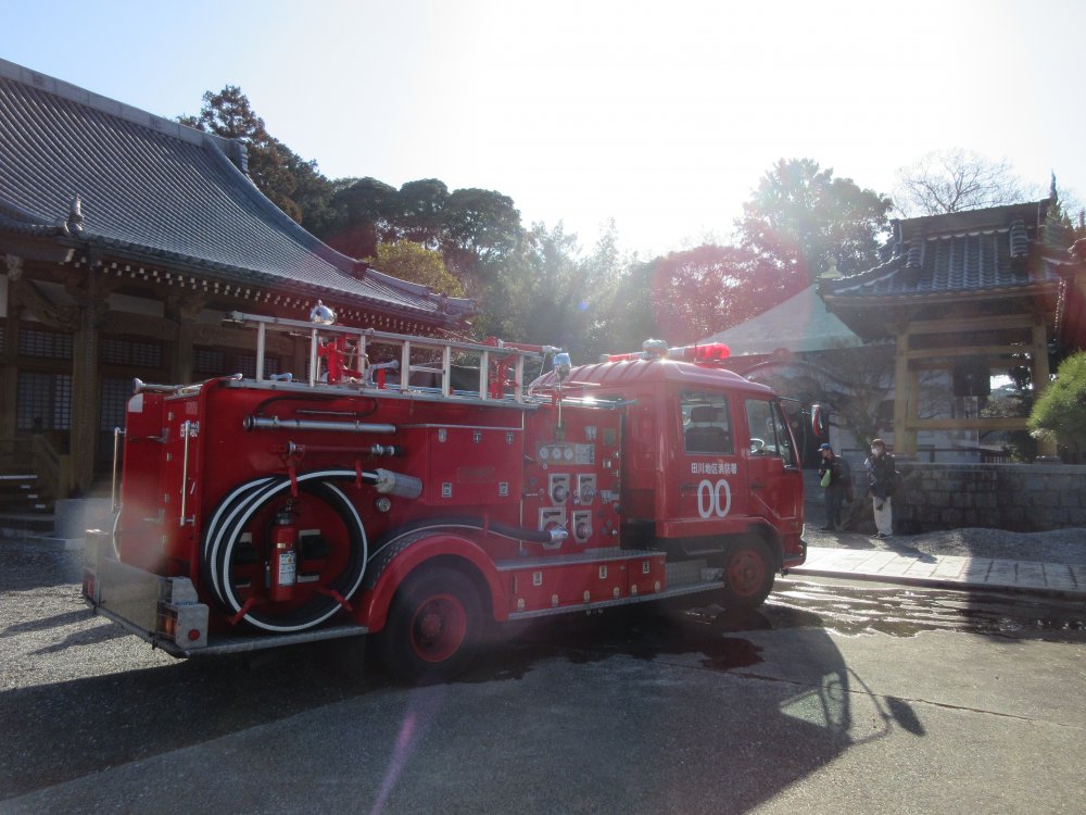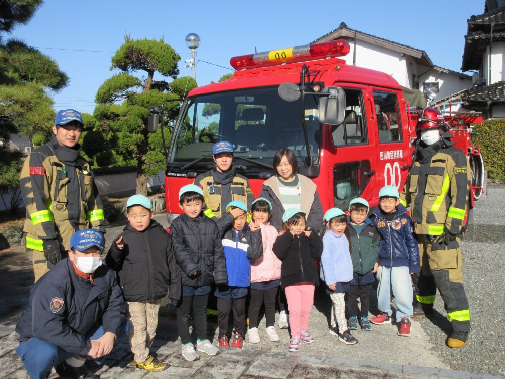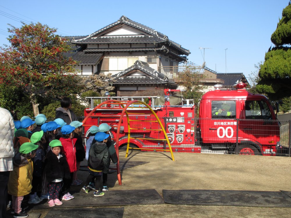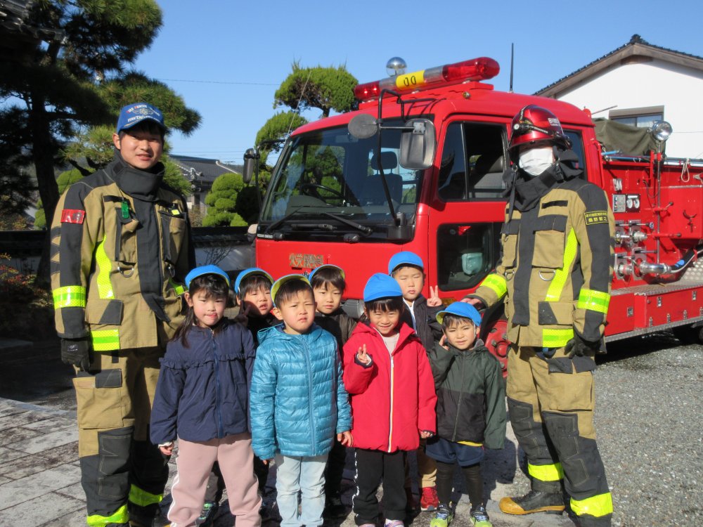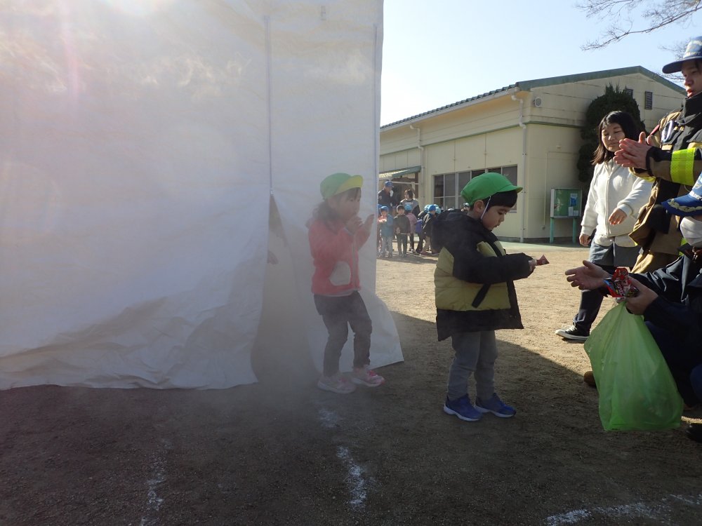 毎年1月26日は文化財防火デーです。お寺で行われる防火訓練を、今年は保育園も合同で行わせていただきました。境内から火の手が上がっているのを保育士が発見、初期消火を行い、通報によって駆けつけた消防車が実際に放水を行って消火完了する、という内容です。また、訓練終了後(体に無害な)煙を充満させたテントの中を抜けていく、火災の疑似体験を行いました。火事の怖さ、訓練の大切さを身を以てよりいっそう感じました。