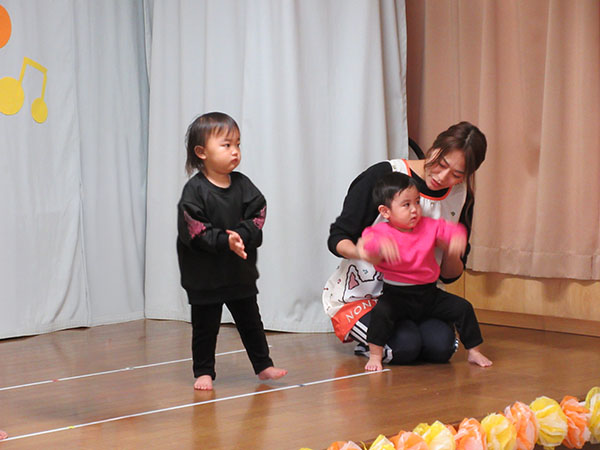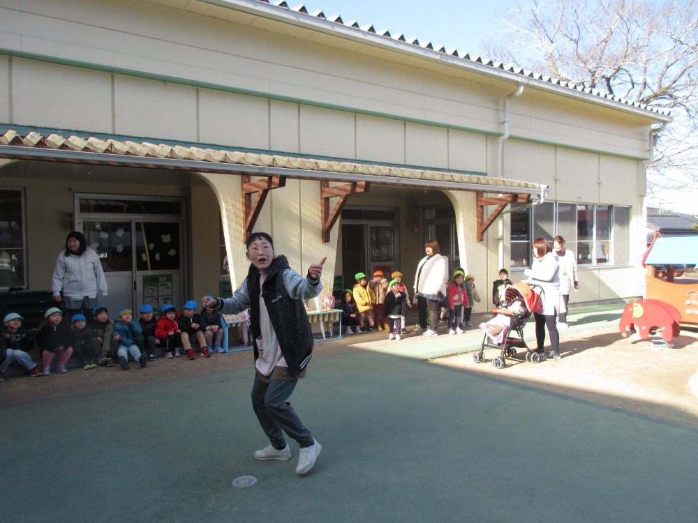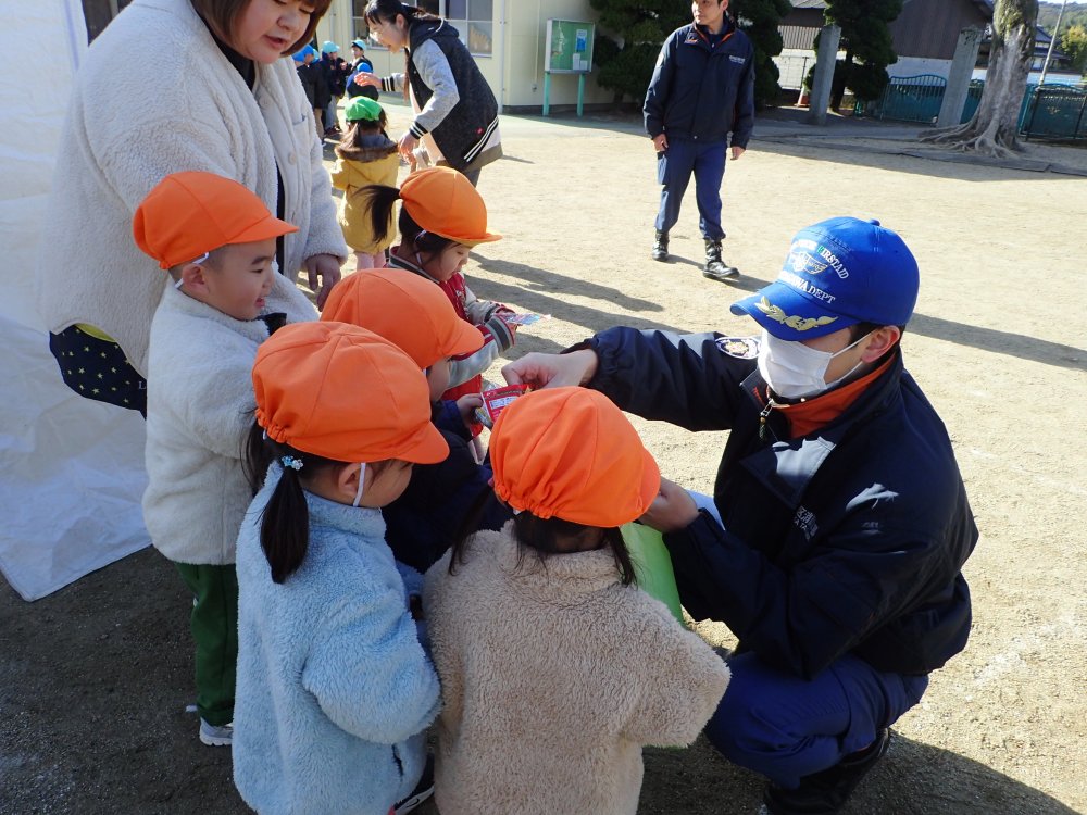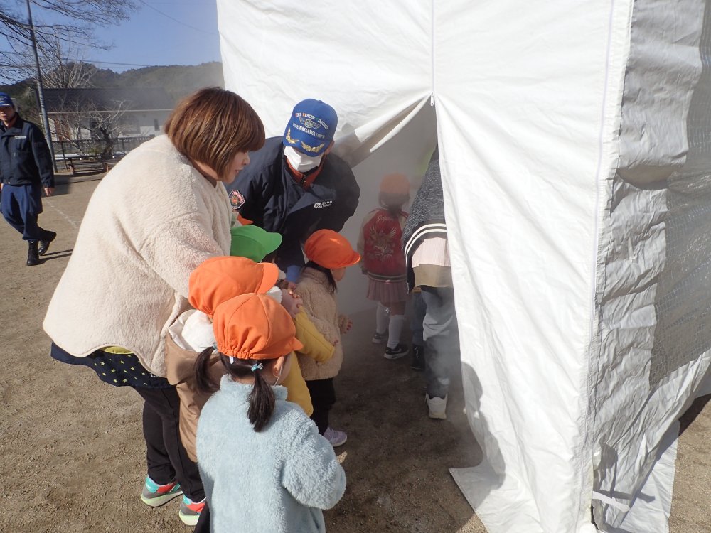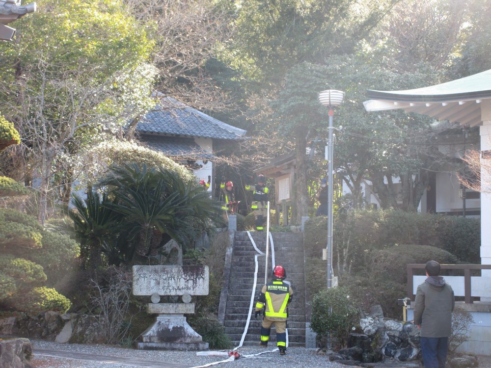 毎年1月26日は文化財防火デーです。お寺で行われる防火訓練を、今年は保育園も合同で行わせていただきました。境内から火の手が上がっているのを保育士が発見、初期消火を行い、通報によって駆けつけた消防車が実際に放水を行って消火完了する、という内容です。また、訓練終了後(体に無害な)煙を充満させたテントの中を抜けていく、火災の疑似体験を行いました。火事の怖さ、訓練の大切さを身を以てよりいっそう感じました。