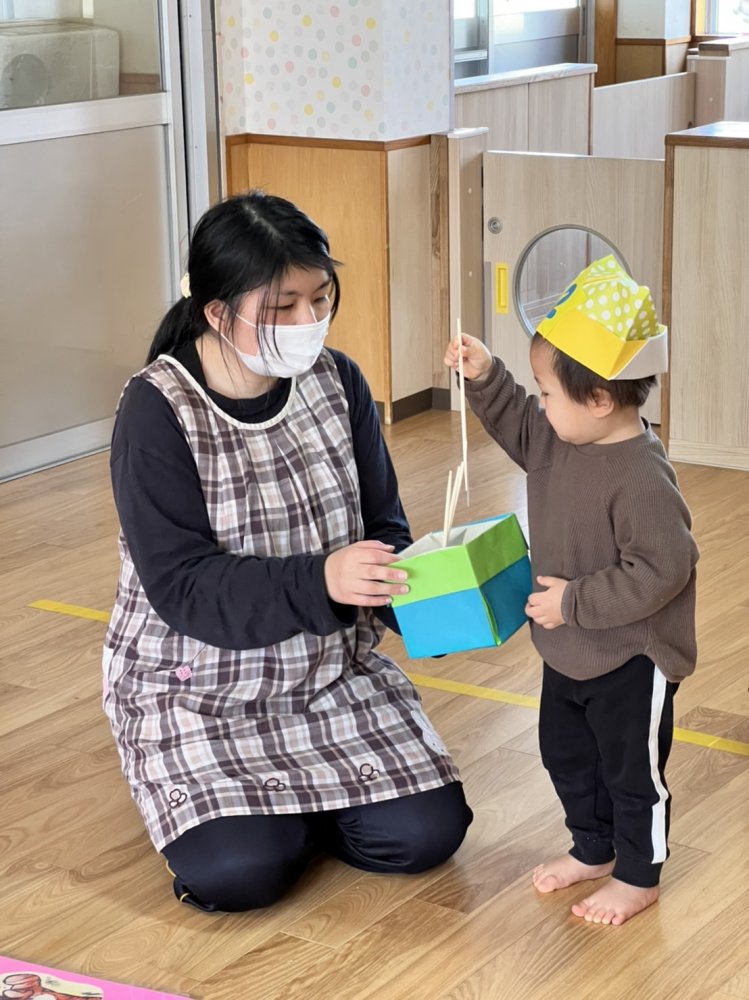 3月生まれのおともだちのお誕生会をしました。そして先月の2月生まれのお誕生会のときにお休みをしていたおともだちも一緒にお祝いしました。2人とも質問カードを引いて、同じ絵柄のカードをちゃんと見つけて取っていました。