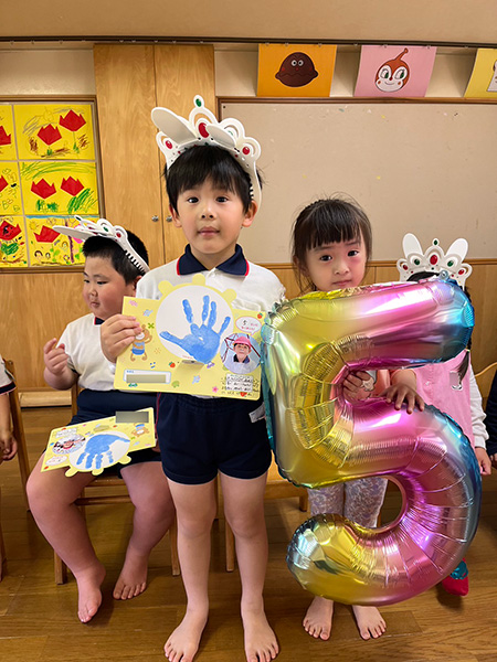 4月生まれのおともだちのお誕生会をしました。今月は6人のお誕生さんでした。朝から「カードを誰からもらおっかなぁ」などと考えて楽しみにしていた子どもたちです。質問にもきちんと答えていました。ある女の子は「パパの名前は?」という質問に「33歳」というかわいい答を答えていました。