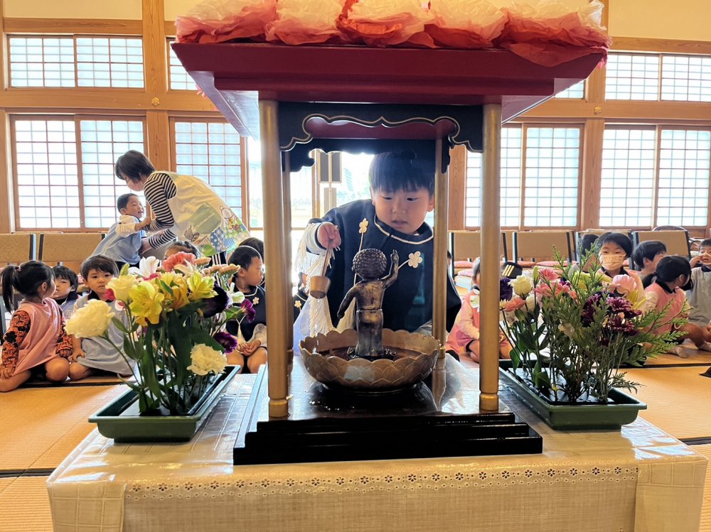 普段お寺に行くことはないので、みんなお寺に行くことを楽しみにしていました。お釈迦様のお話を園長先生から聞いた後、甘露の雨にちなんで一人ずつ(赤ちゃん姿の)お釈迦様に甘茶をかけてお参りしました。
