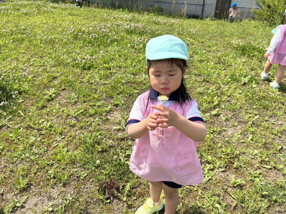 少し前のことですが・・・こあら組さんとうさぎ組さんが近くの広場にお散歩に行きました。こあら組さんは仲良く手を繋いで、うさぎ組さんはお散歩ロープを持ってお散歩しました。みんな楽しそうに走り回ったり、たんぽぽやシロツメクサを摘んで春の自然にたくさん触れてきました。