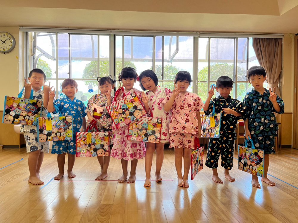 夏祭りをしました。子どもたちは何日も前から「あと何回寝たら・・・」と数えて、この日をとても楽しみにしていました。甚平、浴衣などを着てお祭りの雰囲気を味わってみんなで楽しむことができました。