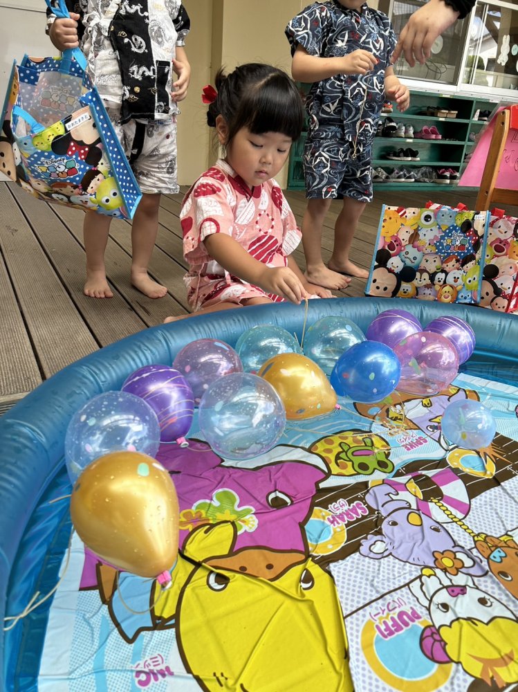 チケットとカバンを持って、保育園の中のあちこちに用意されたお店屋さんを巡りに出発です。ヨーヨー釣り、くじ引き、輪投げ、駄菓子コーナーなどを巡って、自分でチケットを取ってお店屋さんに渡すのが楽しそうでした。輪投げはなかなか入らなかったり、ヨーヨー釣りは自分の好きな柄を選んで取っていました。