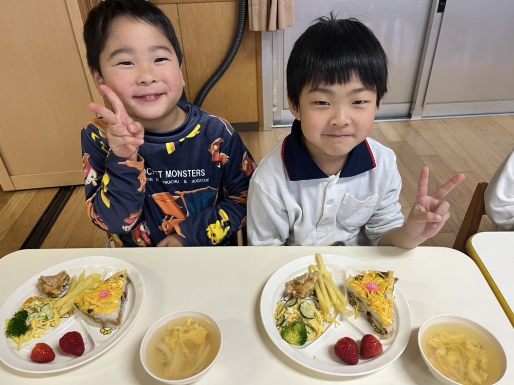 給食もうさぎ組さんからきりん組さんまで一緒に食べました。 特性のお寿司もおいしかったです。