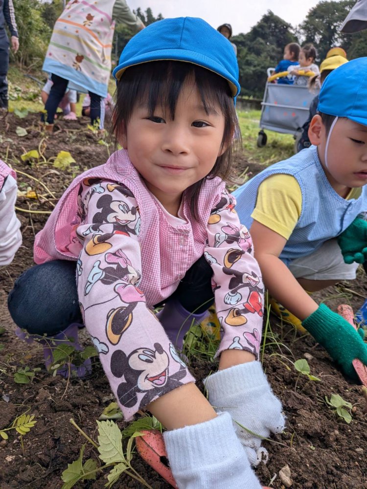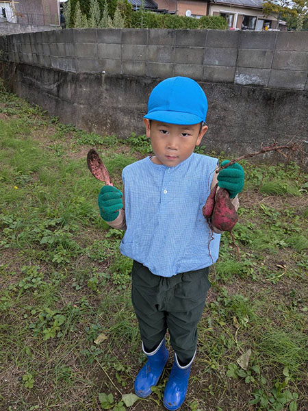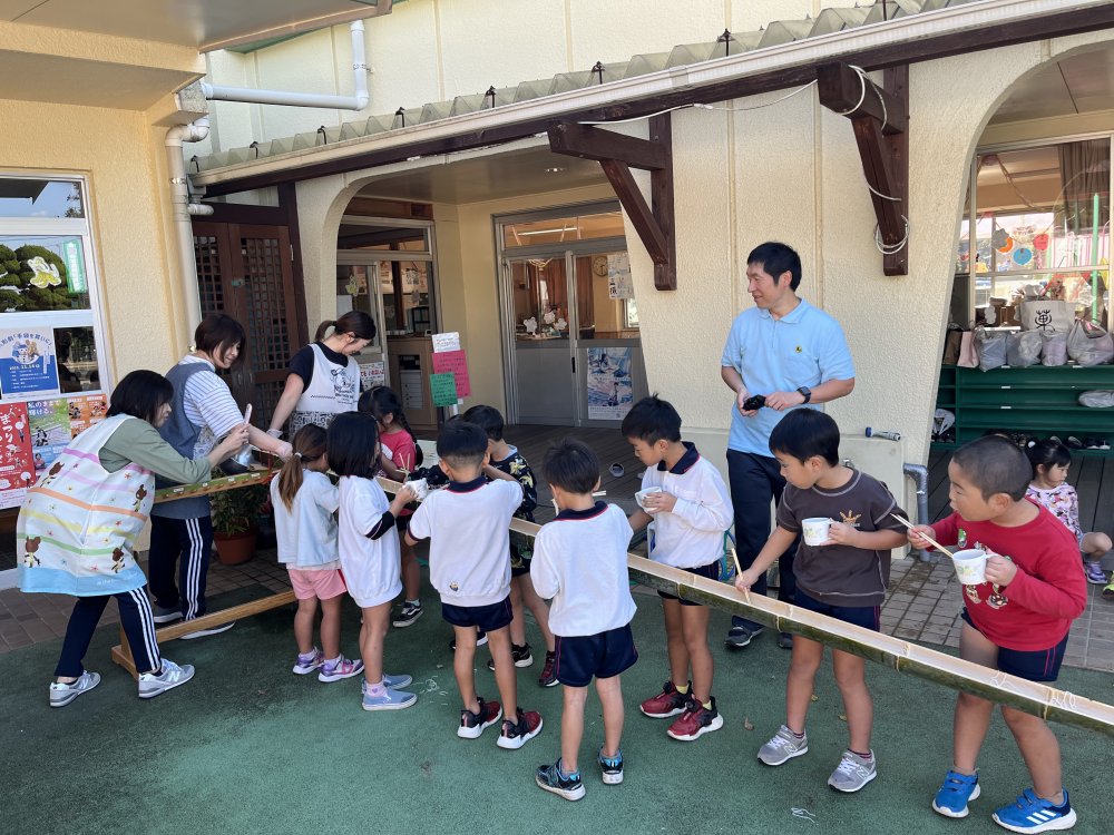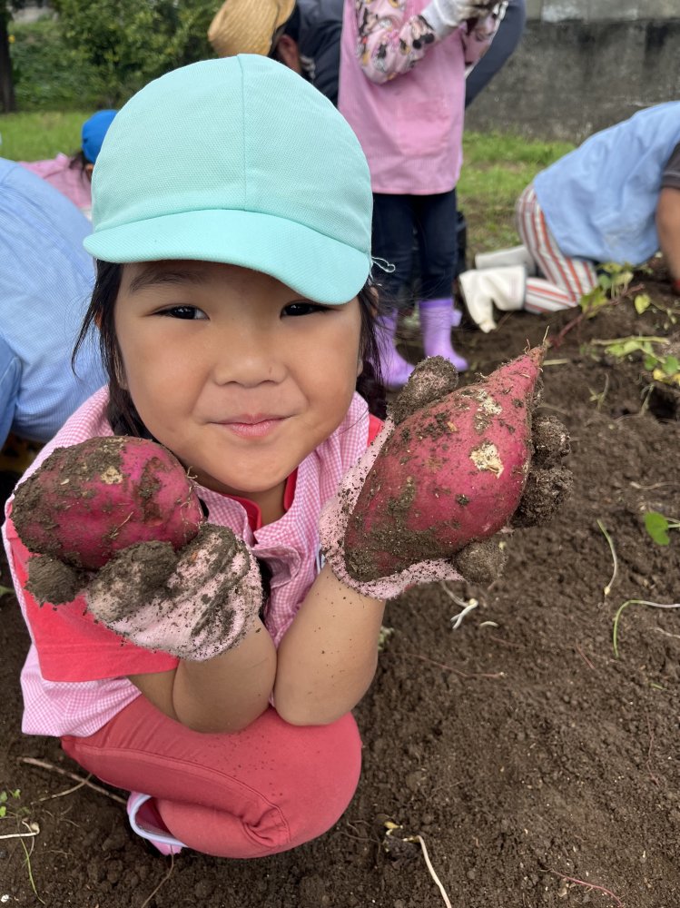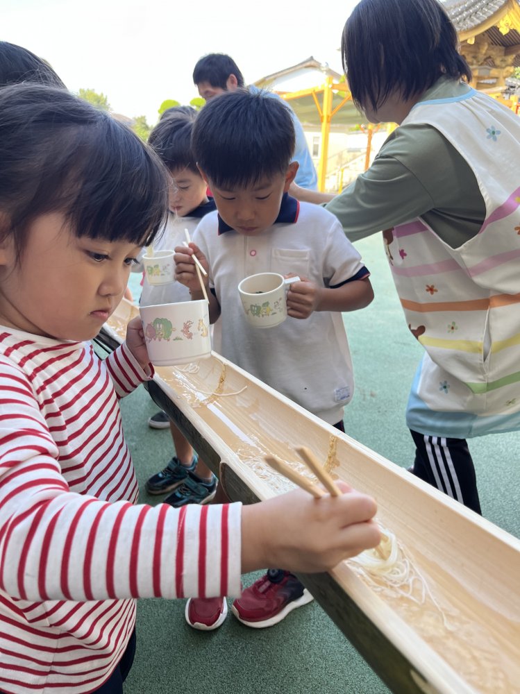 午前中は畑でイモ掘りをして、午後は流しそうめんをしました。スコップで一生懸命土を掘り、イモを見つけると「あった~!」と大喜びでたくさん収穫していました。流しそうめんは初体験のおともだちが多くて、最初はうまくそうめんを掴めなくて流れていっていましたが、徐々に掴めるようになるとたくさん取って食べて楽しんでいました。