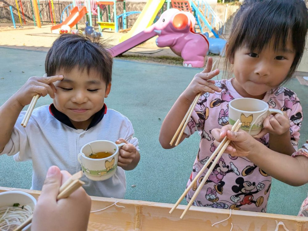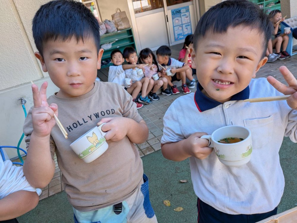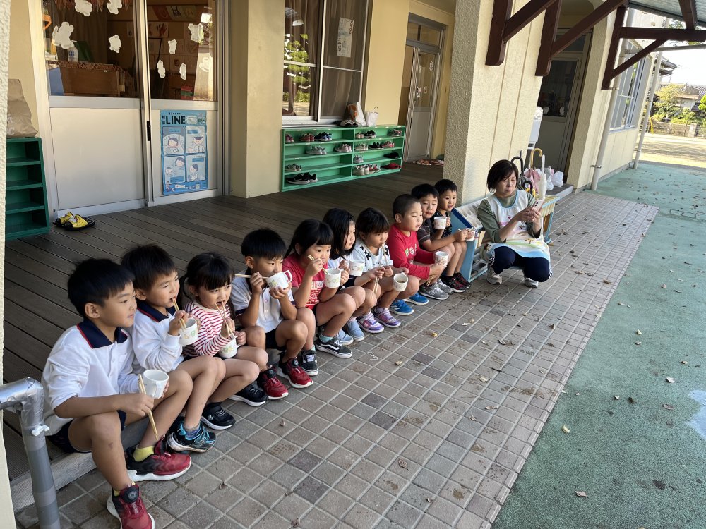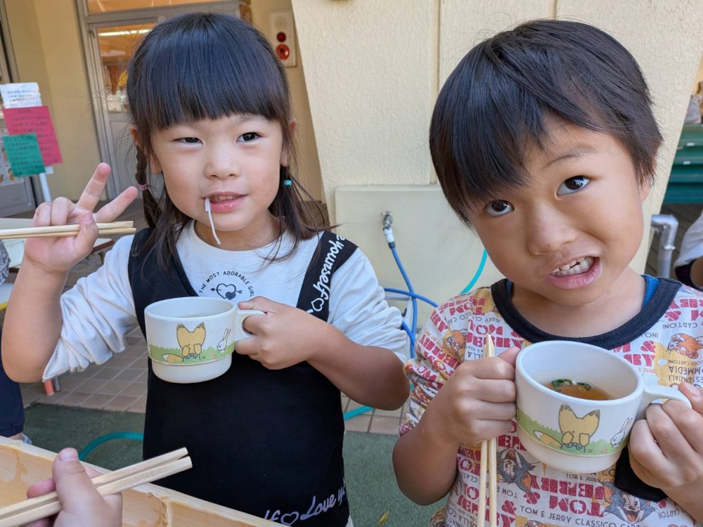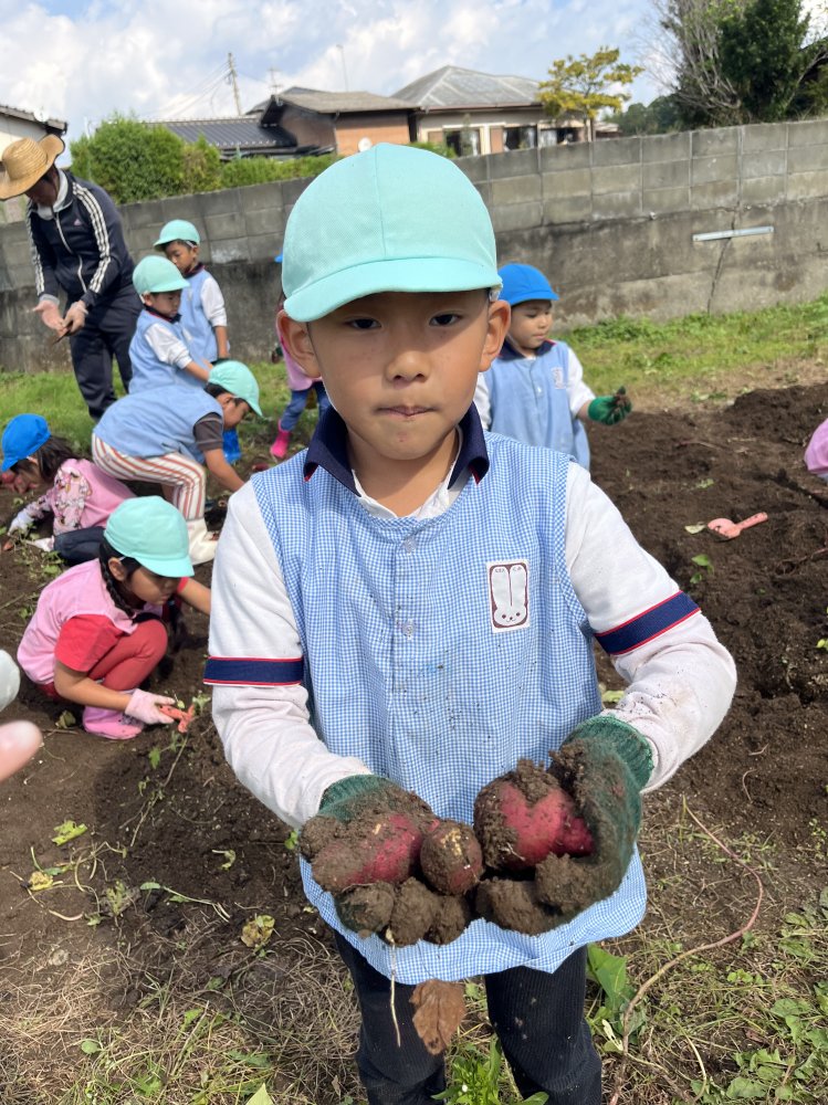 午前中は畑でイモ掘りをして、午後は流しそうめんをしました。スコップで一生懸命土を掘り、イモを見つけると「あった~!」と大喜びでたくさん収穫していました。流しそうめんは初体験のおともだちが多くて、最初はうまくそうめんを掴めなくて流れていっていましたが、徐々に掴めるようになるとたくさん取って食べて楽しんでいました。